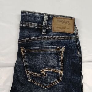 These cute, distressed Silver Jean Co jeans offer a sleek skinny fit in a rich blue color, perfect for a modern and stylish look. The signature stitched pattern on the back pocket adds a unique touch to your wardrobe. Ideal for any occasion, these jeans combine comfort and style effortlessly. The waist offers some stretch of about 2 inches with one button and zipper closure.