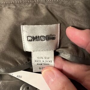 Chico lightweight jacket, dark olive. Size 3. Button front . Roll up sleeves with button tan. Lower front pockets . Yoke on back with decorative button detail . 100% Silk