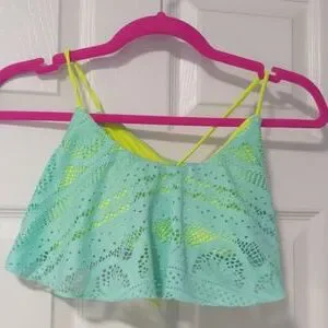 A bundle of swimsuits! 2 two piece sets and a swim top. 1. lemon off the shoulder bikini. The bottoms have a cute waist strap. Only worn a few times, in great condition. No pilling Brand unknown 2. No Boundaries Mint green and neon bikini. Great for summer and features a pretty flowy lace top. Purchased on vacation and only worn once. No pilling. 3. Ambrielle Brand bikini top. can be worn with your own swim bottoms. Cups are padded and molded.