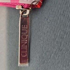 Color Accent: Bright pink/fuchsia zipper and trim. The zipper pull on the larger bag is metal with the "CLINIQUE" logo.