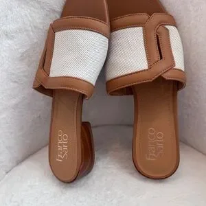 Step into style with Franco Sarto's chic slide sandals. Featuring a sophisticated tan and white design, these shoes offer both comfort and elegance for any occasion.