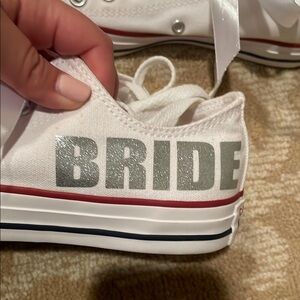 Elegant Converse women's shoes in white, perfect for a special occasion. Features stylish 'Bride' detailing. Never worn, size 7 women’s, men’s 5