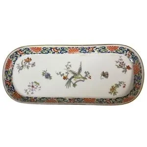Limoges porcelain is known for its quality and artistry, with pieces often hand-painted and featuring intricate designs. The style of decoration on this dish, with its bird and floral motifs, is reminiscent of both Chinese export porcelain and patterns like Wedgwood Kutani Crane. The dish could be used as a serving platter or a decorative piece, reflecting the versatility of Limoges porcelain