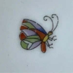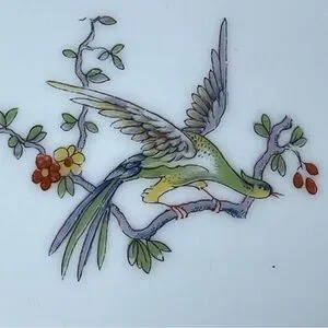 Limoges dish, from France, featuring a bird and floral design. Limoges porcelain is hard-paste porcelain produced in the city of Limoges, France, starting in the late 18th century. The dish exhibits a white background with a central motif of a colorful bird perched on a branch, surrounded by various floral elements. The border of the dish is adorned with a repeating pattern of flowers and foliage in hues of orange, blue, and green, accented with gold trim.