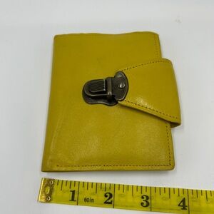 This mustard yellow wallet is crafted from high-quality leather, featuring a sleek design with a silver lock for secure closure. Its compact and stylish form makes it a perfect accessory for any occasion.
