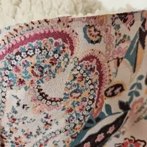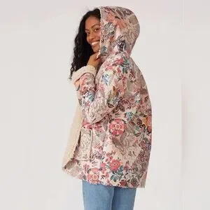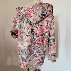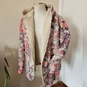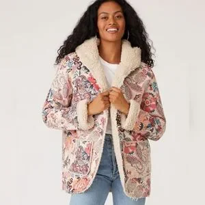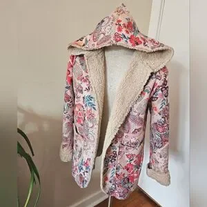 Stylish Paisley and floral hooded jacket with cozy sherpa lining. Perfect for a chic boho look.