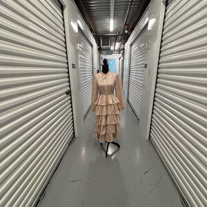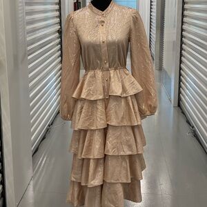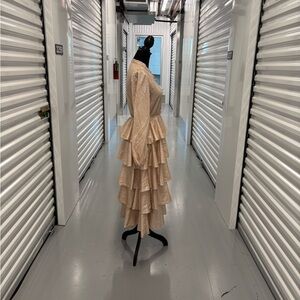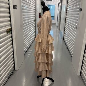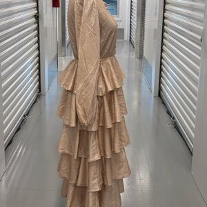 This stunning Mazik gown in tan and gold features a ruffled, tiered design that exudes elegance. The long bishop sleeves and mandarin collar add a touch of sophistication, making it perfect for a bride or wedding guest. Blush pink color. Please Examine Photos Carefully. No Refunds, No Returns, Or Exchanges. If Ordering A Large Amount Of Items They Will Be Mailed In Separate Packages 🙏🏾 Thank You For Shopping My Closet!!!All Items Ordered On The Weekend Will Be Shipped Out On Monday PS… I DO NOT, I REPEAT I DO NOT MEASURE 📏 CLOTHING! Smoke 💨 Free 🏠 Home! The Majority Of My Items Are Kept In Storage