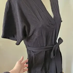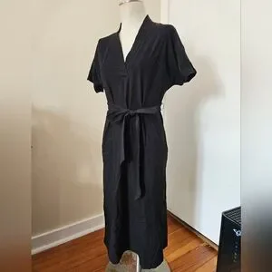 Elegant black dress with short sleeves and adjustable tie belt. Perfect for any occasion.