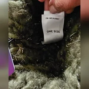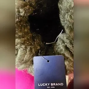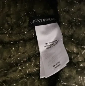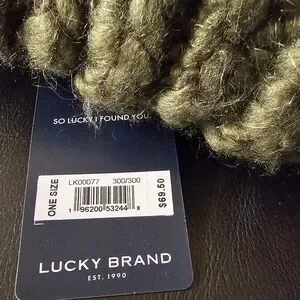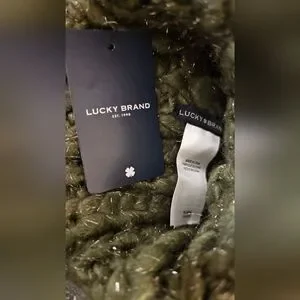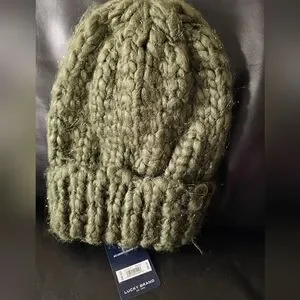 New with Tags Lucky Brand Cozy olive green knit beanie in new giftable condition no wear or callouts. Perfect for chilly days, one size fits all. Arcylic and Polyester blend with silver metallic accents. Unisex design in neutral earth olive green. Ships from smoke-free and pet free home.
