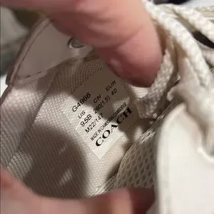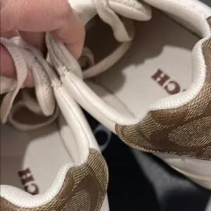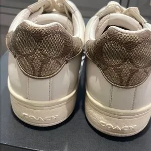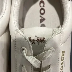 Stylish Coach low top sneakers in chalk leather. Features a sleek design with a classic look. Signature C print on the back. Clean interior. Excellent pre-owned condition.
