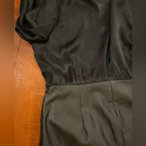 Maeve Black Satin and Faux Leather Dress by Anthropologie. It features long sleeves with cuffs, a cowl neckline, and a wrap-style skirt rached on the left side, that creates a draped effect. Size 16.