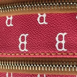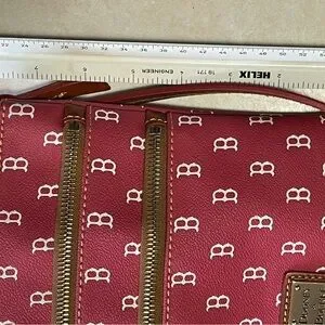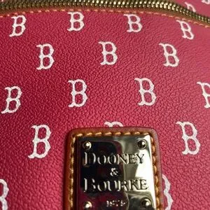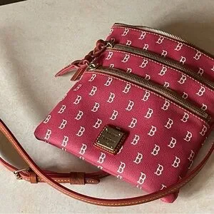 This vibrant red crossbody bag from Dooney & Bourke features a striking geometric pattern, making it a standout accessory. Crafted with a durable material, it offers both style and functionality for any occasion. Leather. Perfect for Boston Red Sox fans!