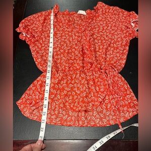 Beautiful red-orange floral blouse. Wrap-style with decorative tie at the left side. Gathered waist.