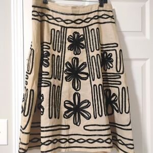 Elegant beige and black vintage skirt with intricate embroidery, fully Lined, side button/zipper closure, Size:14. 100% Linen. Perfect for any occasion By Carol Little. Work of Art.