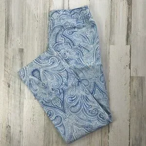 J. McLaughlin blue and white paisley jeans. The mid-rise straight fit, with a zip closure and 5-pocket design, offers a flattering silhouette and comfortable fit. Made from a cotton blend fabric with spandex, these jeans are lightweight, stretchy, and wrinkle-resistant.
