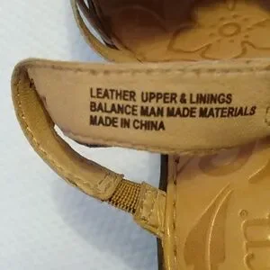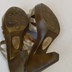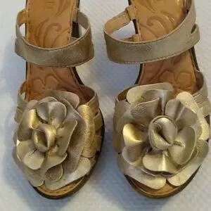 Gold leather upper w/ rose detail. Slip on w/ elastic strap for fit 1" platform & 4" sturdy heel Cute shoe