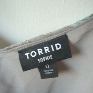 Torrid size 0 (traditional size L) flowing spaghetti strap tank top. V neck design with adjustable straps. Grey background with purple, pink, and green floral design with metallic gold thread stripes throughout. Perfect for summer. Double lightweight layer of sheer with grey slip layer underneath for full coverage.