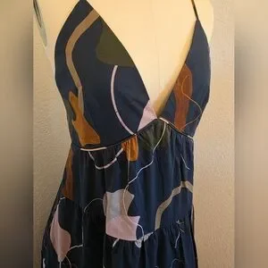 Beautiful Bird & Knoll size medium maxi dress. Flowy confetti type of print on navy background. I searched, but did not find a tag with fabric description. I believe the dress may be 100% cotton. There is lining in bodice/upper 1/2 of dress. Dress does have pockets with center back invisible zipper. The strap can be adjusted as it has loops and button to lengthen or shorten as needed. Flat measurements are approximate: