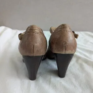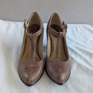 Frye Brown T-strap Pumps Distressed-style Vintage-inspired heels. Hard to find.