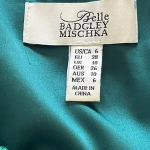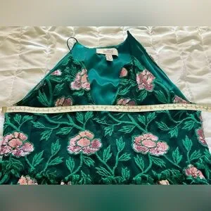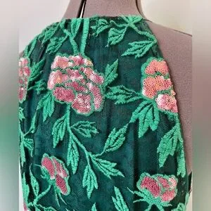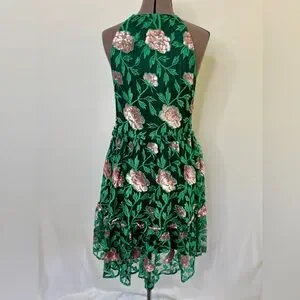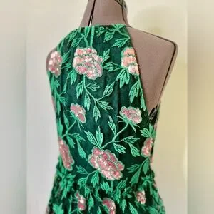 This stunning Badgley Mischka sundress features a vibrant emerald green base adorned with delicate pink sequin floral patterns. The sleeveless design boasts a chic halter neckline and a tiered skirt that adds a playful touch, perfect for a cocktail night out.