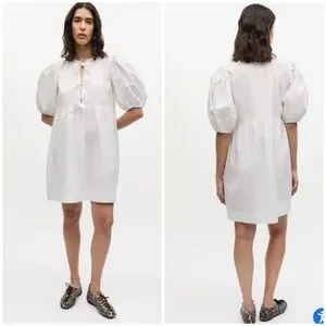 GANNI Cotton Poplin Tie String White Puff Sleeve Mini Dress EU Sz 34 / US sz 2