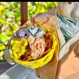 ▪️ Holds a yellow, wooden wicker basket in left hand overflowing with pastel lavender purple, blue & pink paper mâché flowers as well as streams of wood filler