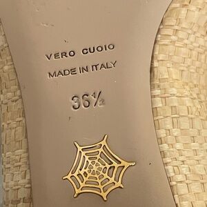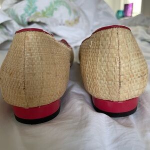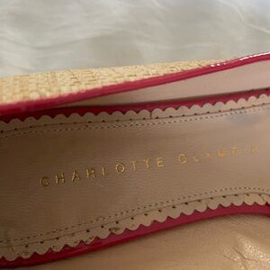 Excellent use condition Charlotte Olympia kitty flats. Fun summertime raffia with leather trim. Step out in style with these charming Charlotte Olympia flats. Featuring a playful cat design, these tan shoes are accented with vibrant red details. Perfect for adding a touch of whimsy to any outfit.
