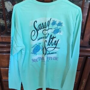Sassy and Salty long sleeve shirt in a vibrant aqua color. Features a stylish front and back graphic. size XL.