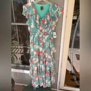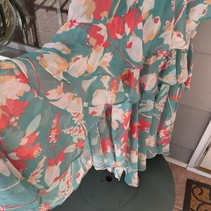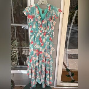 My items are from a pet and smoke free home. Please check out my other antiques and auctions from the hills of Kentucky. Embrace elegance with this floral ruffle dress. Featuring a vibrant teal and coral design, it's perfect for any occasion. Feminine florals and flirty flutter sleeves add charming style to this dress from Taylor. this retails.