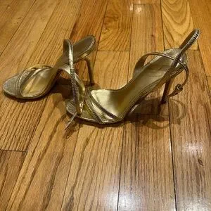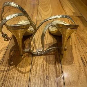 Size: 7.5. Color: Amber gold. Material: leather with snake skin detail. Heel height: 3.9 inches. Worn once.