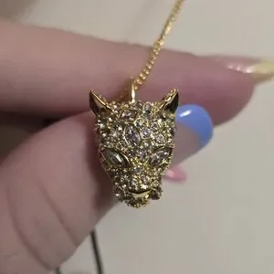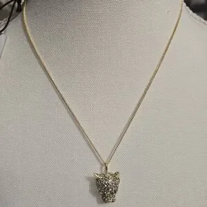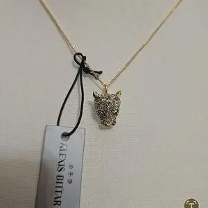 This Alexis Bittar necklace features a delicate gold chain paired with a striking panther pendant. The pendant is intricately designed with textured details, and sparkling jewels. Perfect for those who appreciate unique jewelry.