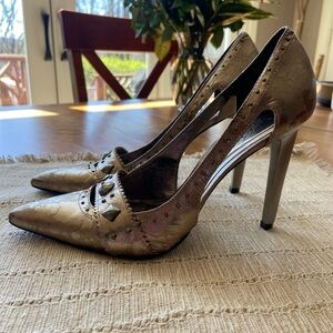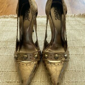 Step out in style with these stunning bronze/gold heels from Carlos Santana. Featuring a chic studded design, 4” heels and cool mottled metallic texture, these shoes are perfect for any occasion.