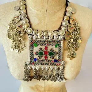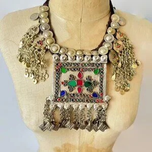 Please keep in mind that most Kuchi and Turkoman / Turkmen / Turkomen items are old and used items with a distinct aged patina. They are a nomadic Afghan people who have created amazing jewelry for centuries. Their colorful jewelry combines new, old, metal, beads, coins, stones and fabric. Many pieces are worn due to being used from every day wear, tribal celebrations, belly dance and wedding uses. They are made with a coin-base metal alloy.