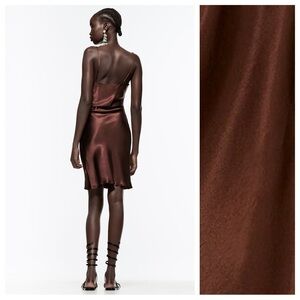 Bundle any 2 items marked 🌹 for $45! NWT. Zara Brown Satin Effect Mini Dress with Side Ruching, V-neckline, adjustable thin straps, side zipper closure. Size S. Ref. 4437/253. Pit to pit 16" flat, waist 15", length 38". N