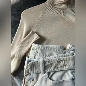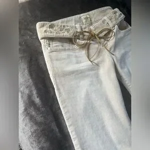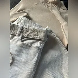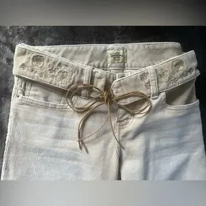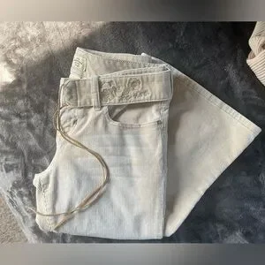 Vintage, RARE, A&F Y2K cream colored courdory, low rise, flare jeans with matching embroidered courdory belt. Size 2, but I think like a 0-2. Can provide measurements if needed. These are adorabe! 98% cotton, and excellent condition and like new. Two button fasten with a zipper.