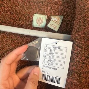 Pretty brown/orange/green combo in the knit throughout with accents of velvet green on the sleeve cuffs, inside the two front pockets, and around the button holes.