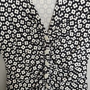 Chic black and white floral blouse with short sleeves. Perfect for casual or formal occasions.