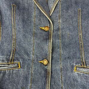 Denim jean blazer is made of medium dark blue denim 100% cotton fabric with contrasting stitching and has a tailored fit.