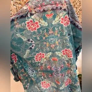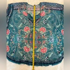 EUC: Awesome, Beautiful, clean great condition. Floral print with birds. Tie front, small ruffle trim, Super beautiful coverup or shirt. Wear however you like! Lightweight, great for travel, summer, beach, resort wear, spring, swimming, etc! *No embroidery on this one** No issues!