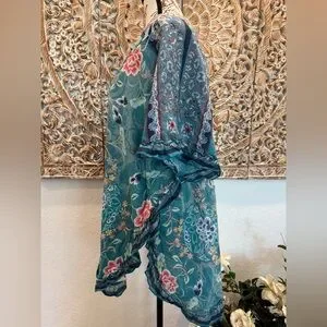 Johnny Was Teal Blue Floral & Birds Lightweight Cotton Ruffle Trim Cover-Up