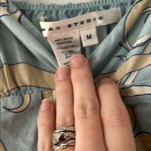 This elegant women's dress features a beautiful blue and cream pattern, perfect for any occasion. Its stylish design offers both comfort and sophistication. A few stains but not noticeable