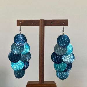 4/$15 Blue Textured Round Disk Waterfall Chandelier Dangling Earrings