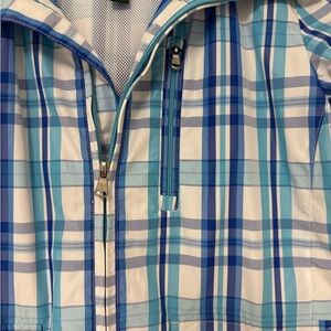 Lauren Active - Ralph Lauren active plaid lightweight full zip jacket, featuring a blue and white plaid pattern. The jacket has a stand-up collar, two slant front pockets with button closures, and long sleeves. The plaid is a blend of white, light blue, and dark blue stripes. The lining is a white mesh polyester. The hardware is silver toned.