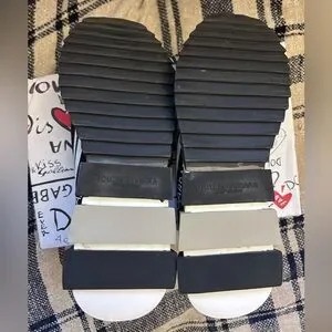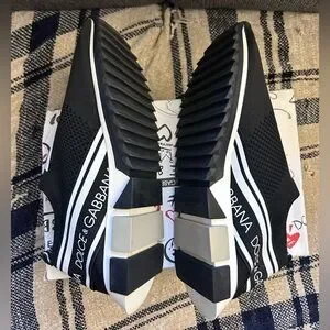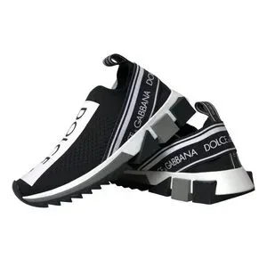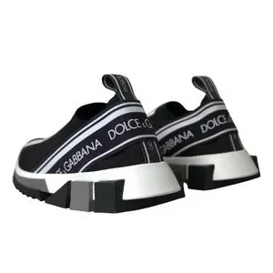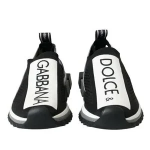 These black Dolce & Gabbana Sorrento knit sneakers are constructed in Italy to a low top silhouette. They feature a rounded toe, soft knit construction, signature logo band across the back, branded pull tabs, bold branding to the vamp, and a white rubber sole with grey and black serrated detailing. We think a lot about how much we want to go on holiday to Sorrento with these Dolce & Gabbana sneakers.