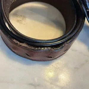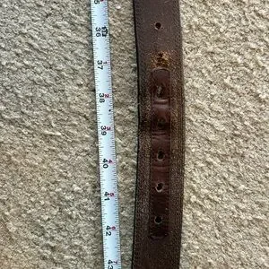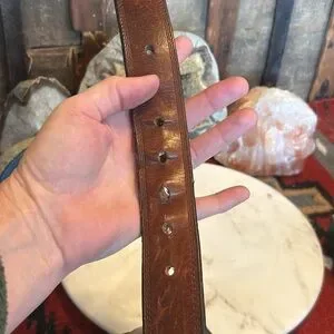 Elevate your style with the Ariat brown leather belt. Crafted for durability and timeless appeal, this belt is perfect for any occasion. It’s vintage and well worn- the holes have some stories to tell!