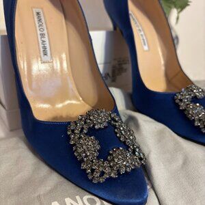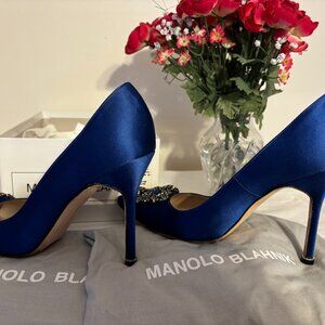 Manolo Blahnik Hangisi Jeweled Heel Blue Satin Pump Shoes - size 8.5