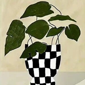 This contemporary piece combines sleek style and great lines. This eye-catching print features a fluidly designed plant in a whimsical black and white checkered pot. Perfect for those who appreciate botanical art, this print captures the essence of nature and modern aesthetics.