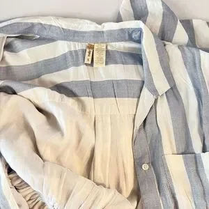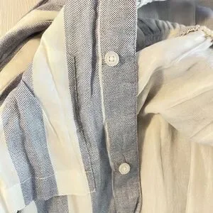 Introducing the Nordstrom Japna blue and white striped shirt dress, perfect for any occasion. This collared dress features a button-down front, cap sleeves, elastic and drawstring waistband for a flattering silhouette. With pockets and fully lined, this short-length dress is both stylish and practical.