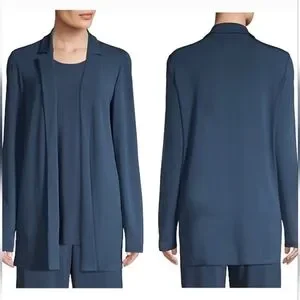 Fit: draped front, longline silhouette, front pockets, unstructured comfort fit.