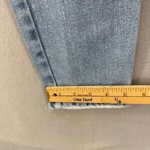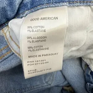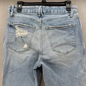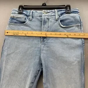 Good American Women's Denim Jeans. Blue in color. Light denim wash. Tagged size 8/29. These women's Good American Jeans feature a five pocket design, factory distressing, a tapered skinny leg and a high rise fit. Style number GCSKCL67T. In preowned condition with minimal signs of wear. Note distressing on leg opening, pictured.